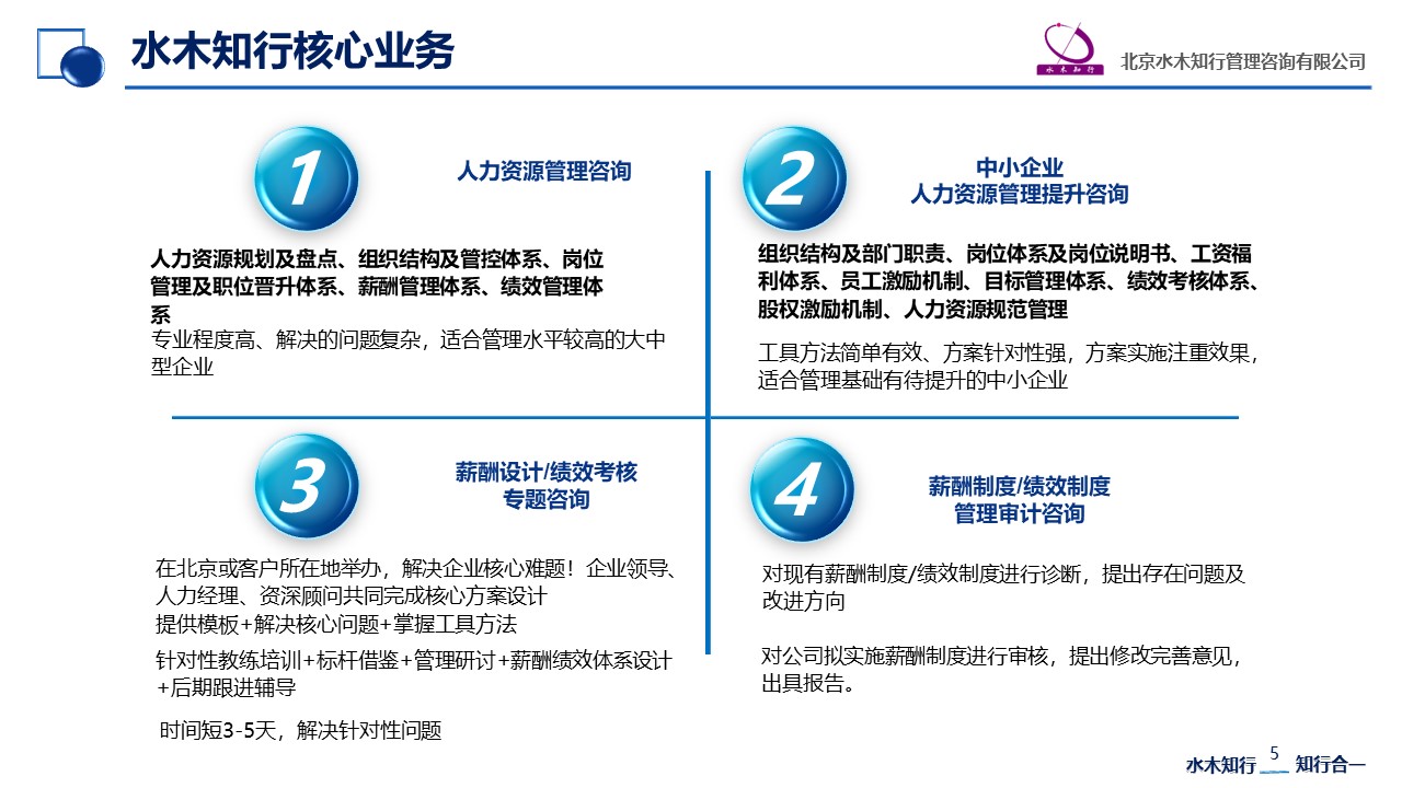 北京水木知行管理咨詢有限公司(www.bjsmzx_com.shanghaixiaojie.cn)專注提供人力資源管理咨詢、人力資源管理培訓、人力資源招聘咨詢、人力資源獵頭服務業務;咨詢業務范圍包括組織結構與管控體系、崗位管理體系、薪酬管理體系、績效管理體系,咨詢形式包括全過程咨詢、教練式咨詢和特訓班;培訓業務包括企業基礎管理...[詳情]